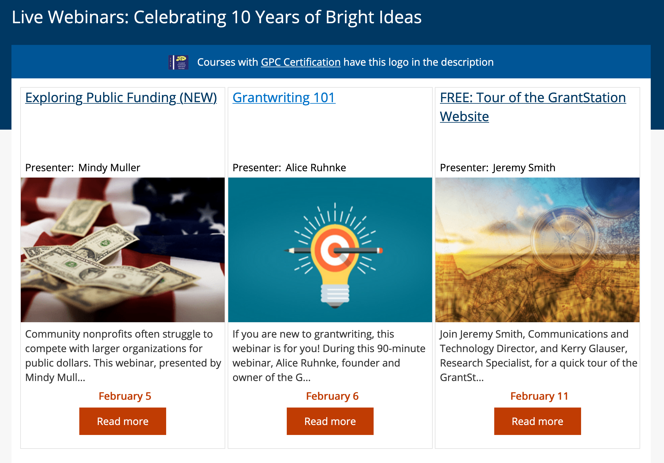 Below are two more screenshots from the GrantStation website. the first is a selection of live webinars users can enroll in. The second is a listing of Rise courses a user can purchase that are related to each other in some way.